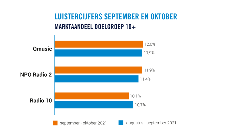 NPO Radio 5 is niet de enige NPO-zender die een stijging laat zien in 10+. NPO Radio 2 groeit naar een marktaandeel van 11,9%. Hiermee is de zender met 0,1% net geen marktleider in 10+.