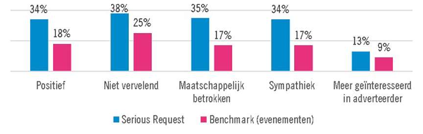Serious Request blijkt tevens een goede springplank te zijn voor adverteerders om imagodoelstellingen te realiseren. Zo worden reclames omtrent Serious Request bijna twee keer zo vaak als positief, sympathiek en maatschappelijk betrokken beschouwd als reclame bij andere evenementen. Merkwaardig puntje: zelfs de interesse in de adverteerder neemt meer toe dan bij de benchmark.