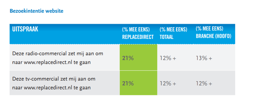 ReplaceDirect zette het totale budget in op zenders van de publieke omroep en profiteerde hiermee van de versterkende effecten van radio naast televisie. Door jarenlang onderzoek in AdMeasure, het onderzoeksinstrument van Ster, weten we veel over de synergetische effecten van multimediale inzet. Zo weten we dat de gecombineerde inzet van radio en televisie wérkt. Vooral op kennisdoelstellingen als merkbekendheid en boodschapoverdracht én op koop- en bezoekintentie.