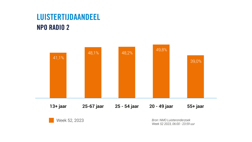 Van de NPO-zenders behaalde NPO Radio 2 het hoogste aandeel. Voor het zesde jaar op rij werd de zender met 14,8 procent luistertijdaandeel de beste beluisterde zender van 2023 in doelgroep 13+. Wekelijks bereikte de zender 3,2 miljoen luisteraars.