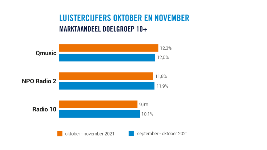 Kijkend naar 10+ zien we dat de top 3 gelijk blijft met de vorige luisterperiode. NPO Radio 2 behoudt met 11,8% een sterke tweede positie. De zender registreert hiermee een lichte daling in vergelijking met de vorige meetperiode, toen het aandeel nog 11,9% was. In de doelgroep 25-67 behaalt NPO Radio 2 een aandeel van 13,6%. In de doelgroepen business-to-business en zwaar zakelijke beslissers blijft de zender de grootste.