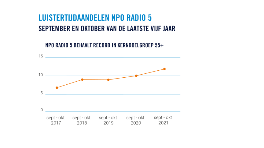 NPO Radio 5 groeit deze luisterperiode tot een nieuw record in de kerndoelgroep 55+. Waar de zender in juli en augustus een luistertijdaandeel behaalde van 10,9%, ziet het hier nu een aandeel van maar liefst 11,7%. Nooit eerder behaalde NPO Radio 5 zo’n hoog aandeel in 55+. Dit blijkt ook uit de luistertijdaandelen van de zender in dezelfde meetperiode in deze doelgroep over de afgelopen 5 jaar: